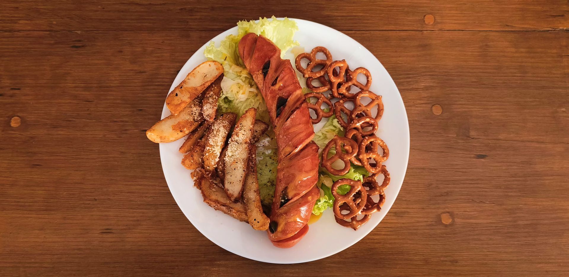 Salchicha tipo Frankfurt cocinada a la plancha, con dorado uniforme que realza su sabor ahumado y su textura jugosa. Elaborada con carne de cerdo de molienda fina y notas especiadas, se sirve en baguettín ligeramente crujiente, acompañado de sauerkraut (col fermentada) y una pincelada de mostaza dulce que equilibra con suavidad. A un costado, pretzels salados completan esta propuesta alemana con carácter, contraste y tradición.